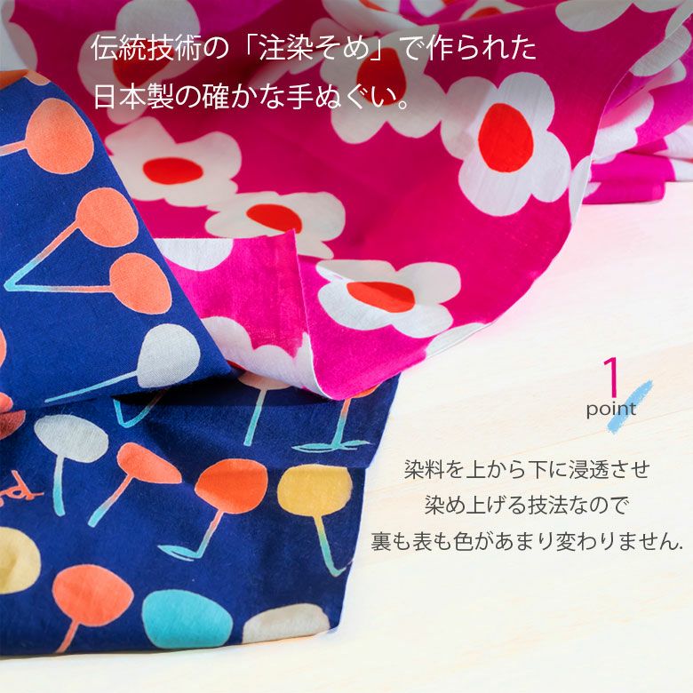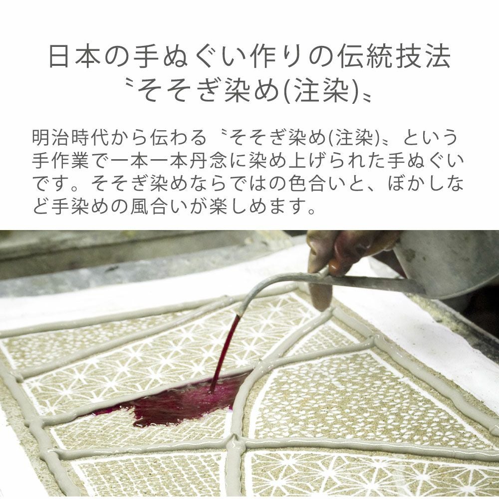 和布華(わふか)の手ぬぐいは、明治時代から伝わるそそぎ染め(注染)という手作業で、一本一本丹念に染め上げられています。そそぎ染めならではの色合いと、ぼかしなど手染めの微妙な風合いが楽しめます。