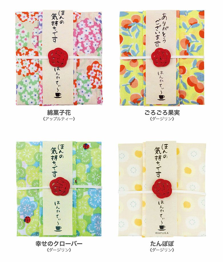 ティーバッグを、日本らしくおめでたいデザインのはんかちで包んだプチギフトです。ご祝儀袋風に包まれてとってもキュート!職場の同僚やお取引先の方、大勢へのお配りギフトや、ちょっとしたお返しギフトに…きっとよろこばれますよ。