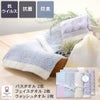 | ウォッシュタオル:34×30cm フェイスタオル:34×75cm バスタオル:60×110cm 箱サイズ:29×39×11cm | |