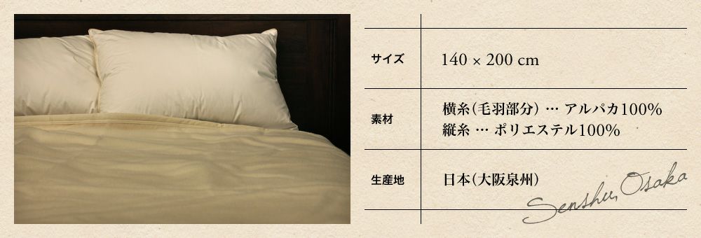 他の画像を見る アルパカ毛布 シングル 上質素材のアルパカを伝統の泉州で仕上げた高品質 毛布 アルパカ毛布 シングル 泉州毛布140×200cm 送料込 受注生産 ¥ 20,130 税込 お気に入りに登録する