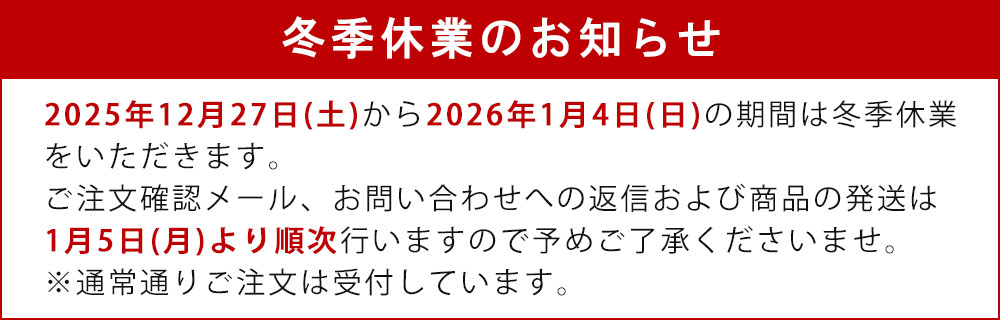 冬季休業のお知らせです。休業中のご注文は翌営業日以降の発送となります。注文・お問い合わせは営業日に順次対応させていただきますのでよろしくお願いします。